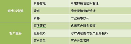公司各個(gè)組織單元下的職能可以進(jìn)行進(jìn)一步的細(xì)分,根據(jù)細(xì)分的職能就可以確定專業(yè)方向上的培訓(xùn)課程體系。人力資源單元可以分為人力資源管理、招聘、員工發(fā)展、績(jī)效、薪酬、員工關(guān)系;行政單元可以分為行政管理、秘書(shū);財(cái)務(wù)單元可以分為財(cái)務(wù)管理、會(huì)計(jì)、審計(jì);物流與供應(yīng)單元可以分為采購(gòu)、物流、倉(cāng)儲(chǔ);生產(chǎn)與質(zhì)量管理單元可以分為生產(chǎn)管理、現(xiàn)場(chǎng)管理、流程管理、質(zhì)量管理、過(guò)程管理;銷(xiāo)售與營(yíng)銷(xiāo)單元可以分為銷(xiāo)售團(tuán)隊(duì)管理、營(yíng)銷(xiāo)、銷(xiāo)售、市場(chǎng);客戶服務(wù)單元可以分為客服管理系統(tǒng)、客戶服務(wù)、客戶關(guān)系。以下為專業(yè)類課程體系部分部分內(nèi)容: